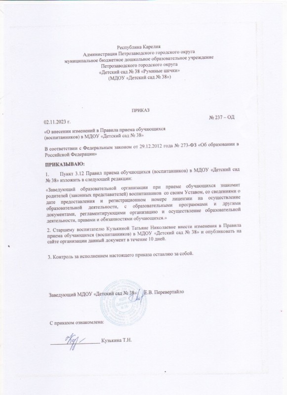 Приказ "О внесении изменений в Правила приема обучающихся (воспитанников) в МДОУ "Детский сад № 38"